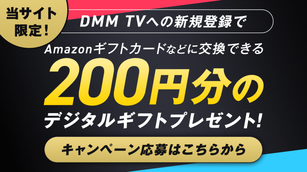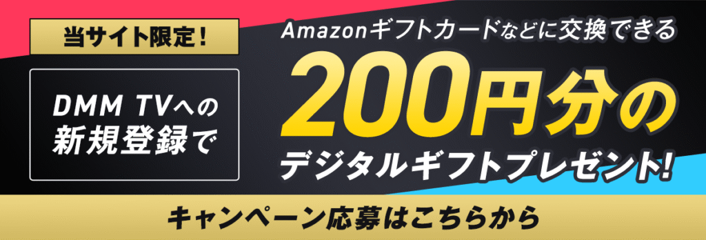 今なら、当サイト経由でDMM TVに新規登録すると、200円分のデジタルギフト券がもれなく(※1)もらえるキャンペーンを実施中!